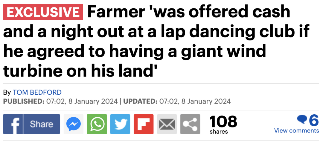但是就在议会讨论该提案的时候,有人爆料该公司在试图说服当地村民签署同意书的时候,居然承诺一村民“只要同意在他们家土地上放置巨型风力涡轮机,就可以获得现金,还能去脱衣舞俱乐部找乐子!”
