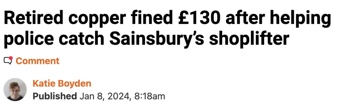 该名退休的英国交通警察Norman Brennan发现一人疑似从伦敦西南部的一家Sainsbury’s偷了东西,于是这位热心老大哥跟踪嫌疑人近两英里,帮助警方抓到了他!当时警方发现这个罪犯的背包里装有九瓶偷来的酒。
