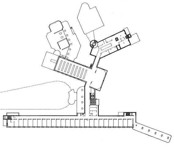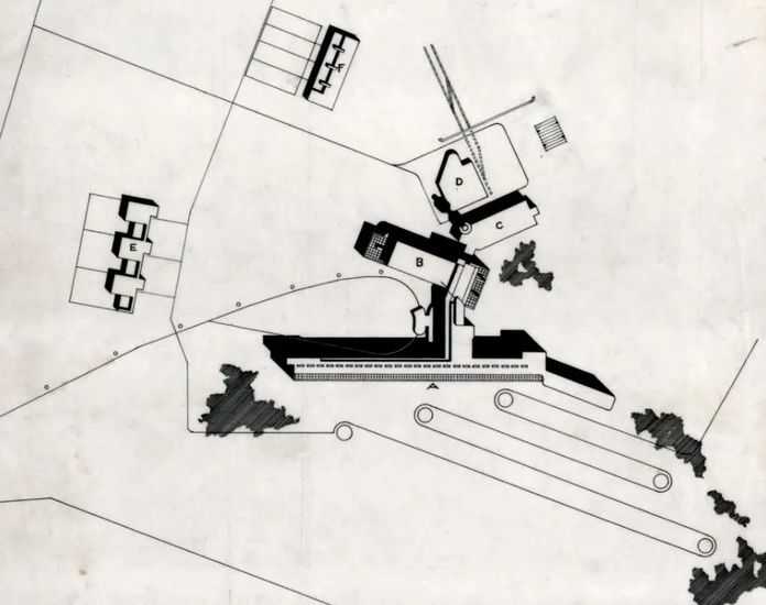 在競賽階段,初級醫師的階梯式建築與B翼的方向一致,長邊與入口軸線平行,員工樓的長立面也朝南,停屍房位於維修樓北側,靠近主樓,高級醫生的住所則位於主樓的較遠處。