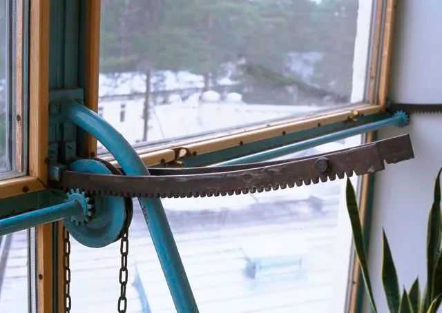 帶有L形窗框的木質雙層玻璃窗,通過帶有垂直開口的玻璃板實現永久通風。
