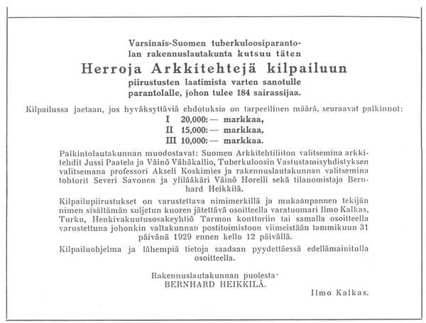 1928年秋,負責建設帕米歐療養院的芬蘭西南部結核病療養院委員會發布了以下公告:”阿爾瓦·阿爾託在公開競標中勝出。」