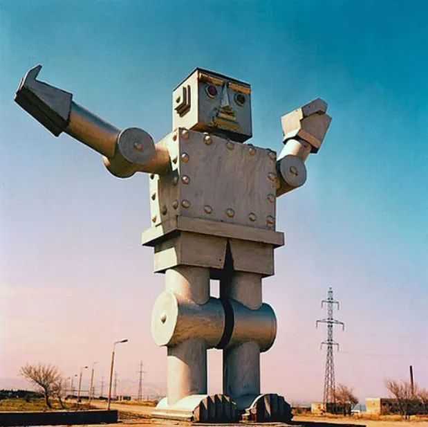 鏽跡斑斑的技術和社會進步的象徵:一座巨大的機器人雕像矗立在亞塞拜然蘇姆蓋特的前蘇聯時期合成橡膠工廠外。