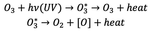 臭氧分子的結構使它對紫外線有極強的吸收能力,可以將絕大多數紫外線光子的能量轉化為熱能耗散: