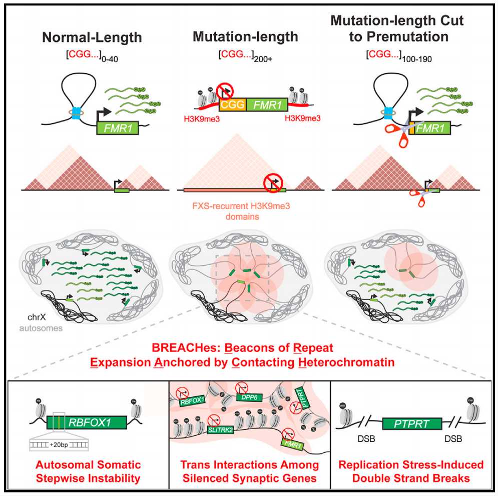 FXS經典模型認為它是一種由CGG STR擴增導致FMR1啟動子局部DNA甲基化,進而導致FMR1轉錄沉默和FMRP丟失的單基因疾病,且這種STR僅出現在X染色體上,而這項工作基於FXS患者死後腦組織或細胞系研究資料出乎意料地發現在常染色體上也存在STR,並提出了空間協調轉錄沉默模型,為探索遠端異染色質介導的沉默與FXS中其他已知分子表型之間的機制相互作用開闢了未來的研究方向。