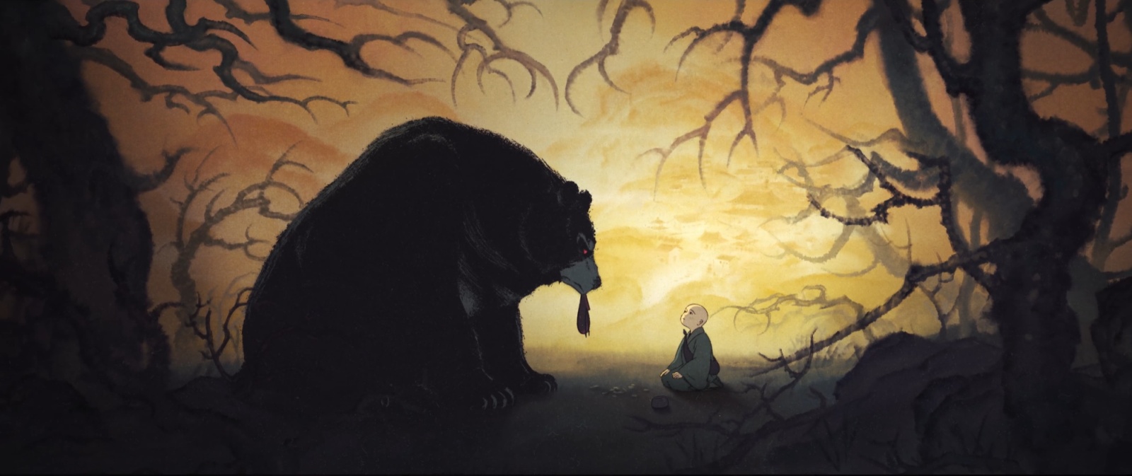 《西游记》里黑熊精和金池是谈佛论道的朋友,而短片里,黑熊改编为金池的贪欲化身,通过两者的关系变化描绘了金池是如何被贪欲吞噬的:少年金池初次和黑熊见面时,只是对望的一人一熊。