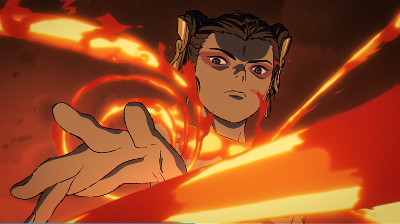 在牛魔王的剧情之外,短片最大的亮点是贡献了一个极为出彩的哪吒形象。以往动漫作品里的哪吒基本是处在成长阶段的少年哪吒,而本片里则是一个已经成长完毕的青年哪吒,多了一层成熟乃至神性。火焰山对战牛魔王一幕帅得石破天惊,视觉冲击力拉满。