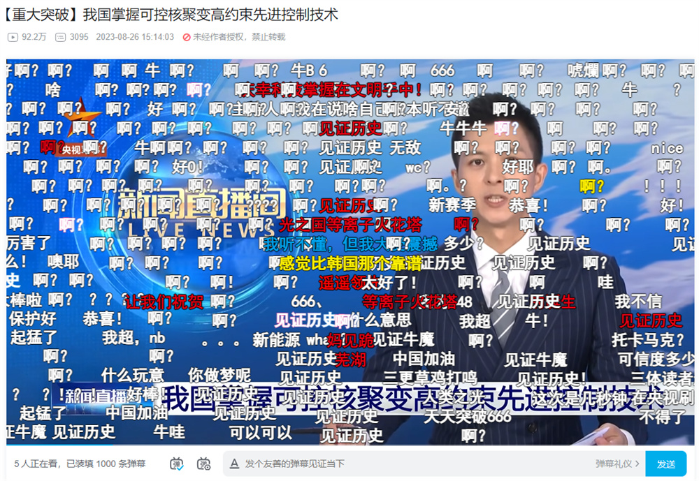 今年众多科技突破也让用户频频发出“啊?”的赞叹。8月,我国宣布掌握可控核聚变高约束先进控制技术, “人造太阳”似乎不再是遥不可及的梦想。相关视频成为了用户发送“啊?”弹幕最多的科技发现类内容。