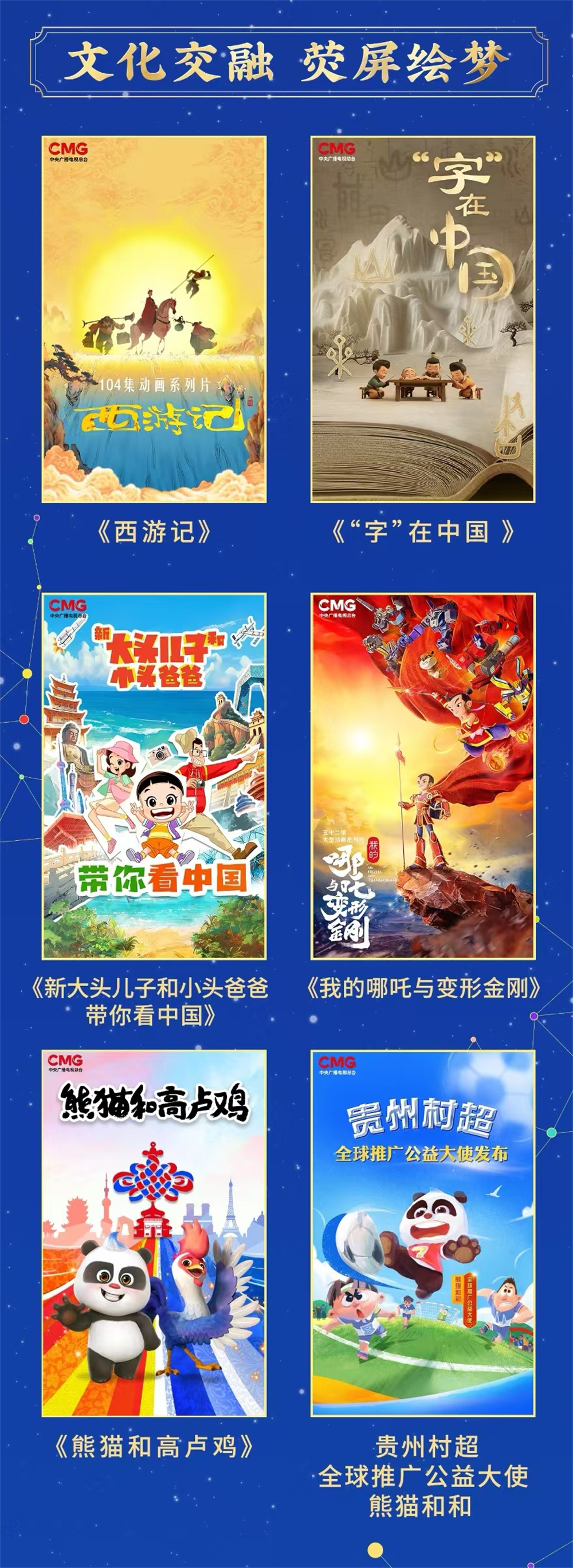 该篇章还发布了蕴含中国风格和时代特色的动画新作,包括以儿童视角展现新时代中国风俗文化、人文底蕴和发展成果的《新大头儿子和小头爸爸——带你看中国》,以及讲述中华汉字的起源和演变,展现汉字文化内涵和哲学思想的《“字”在中国》。中美合拍动画片《我的哪吒与变形金刚》把中国神话中的“哪吒”和美国家喻户晓的“变形金刚”两个经典IP跨界融合。