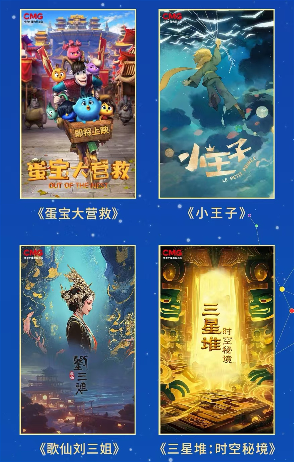 “文明互鉴 光影交响”篇章推出多部动画电影,其中总台原创的《新大头儿子和小头爸爸6:迷你大冒险》将于今年国庆期间上映,讲述父子俩在微观世界中开启全新奇幻之旅的冒险故事;中泰合作的《蛋宝大营救》将中国元素融入其中,演绎一个关于爱和勇气的故事;国际知名儿童文学IP改编电影《小王子》、中国首部民歌动画电影《歌仙刘三姐》、文博历史探秘主题动画电影《三星堆:时空秘境》生动演绎动画与电影艺术交融的独特魅力。