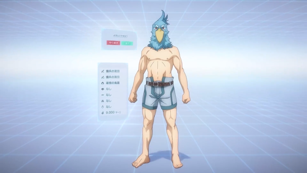 因为朋友的推荐,乐郎化名“桑乐”准备向VR神作《香格里拉边境》发起挑战。一进入游戏,就是非常开放的“捏脸系统”(外形塑造系统),而作为操作党,桑乐上来就卖掉了初始装备,全部换成钱(这款游戏的自由度异常惊人),只留了一个鸟头人身的造型,辨识度拉满。自此“蓝头鸟人”也成为了本番一大记忆点。