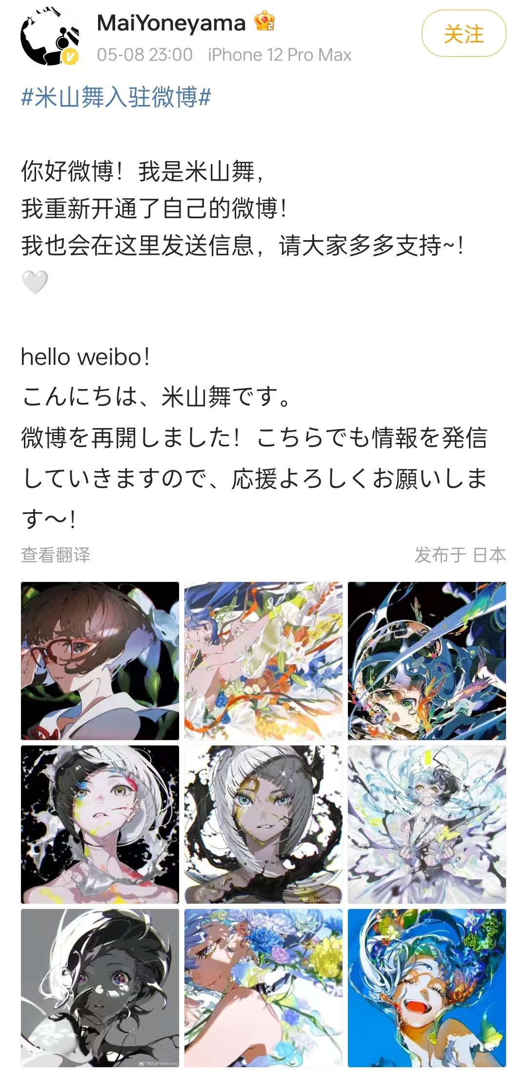5月8日,日本大神级插画师米山舞入驻微博!众多动漫粉闻风而动,短时间内,米山舞微博粉丝数突破20万。
