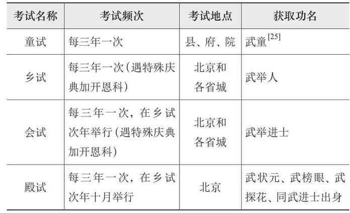 考試的基本形式接近明代,儘管隨著時間變遷這種標準也在逐漸弱化。武舉考試的大致結構如下表所示。