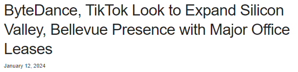 依照当前的态势,TikTok在2024年的发展只会更好。前不久,TikTok还租下了西雅图黄金地区Bellevue和湾区的两栋大楼,扩招趋势明显。
