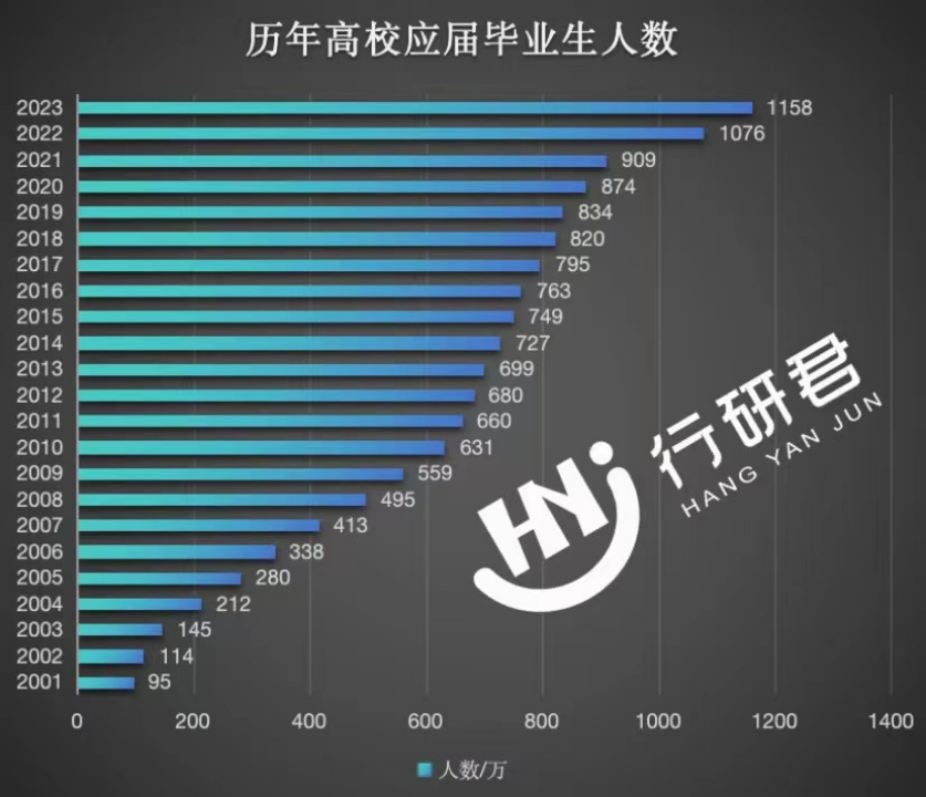 据教育部公布的数据,2024届高校毕业生人数预计将达到1187万人,较2023年增加29万,再创历史新高。