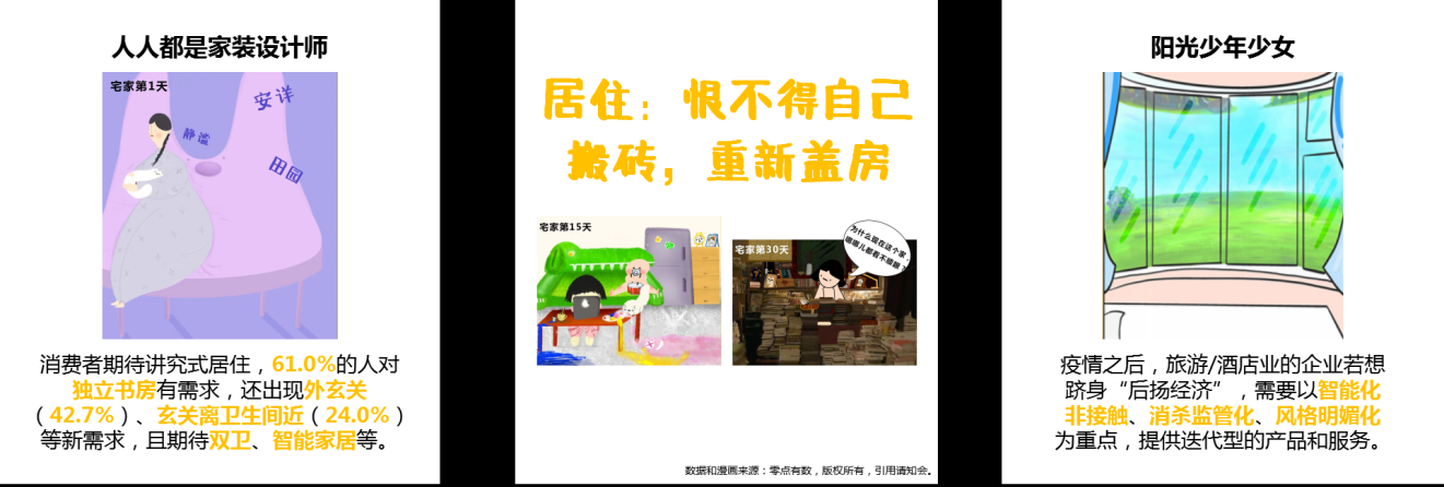 例如,在房子的需求上,以往人们不太会关注到玄关,但疫情让大家发现了玄关的重要性——我们需要一个可以独立消杀、换鞋的地方,以防止把病毒带进家里。此外,书房的重要性也被许多人关注了起来。由于要在家办公,我们每天8小时的工作时间都要在书房度过,会发现许多原先设计不合理的地方——例如插座位置、网线接口或是采光条件等等。另外,视频会议会让同事、客户、上司们都看到你家的书房摆设,大家会发现怎么你家是白墙啊?书架上的书好像都是装饰品嘛?是不是缺少一点文化气息啊……如今,许多公司已经将“在家办公”作为一种长期的举措,袁岳相信,未来在书房设计这块,会诞生出很大的需求,这其实也是“宅经济”的一部分。