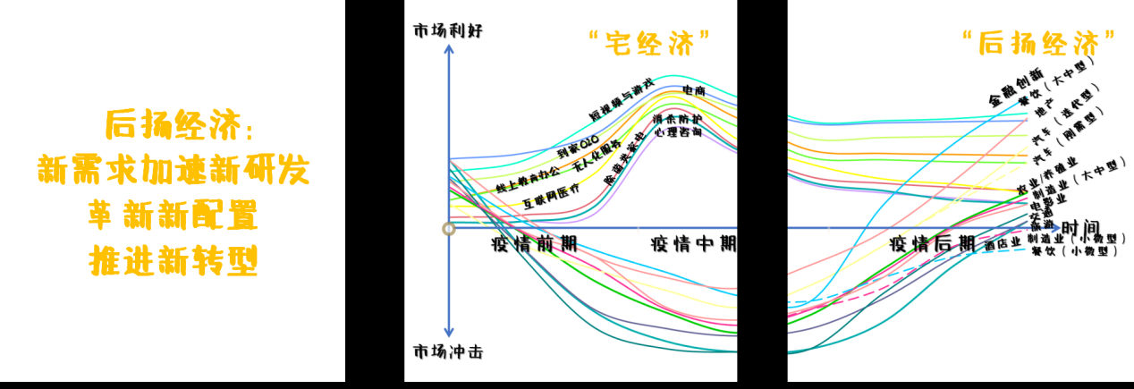 所谓的“后扬经济”,是通过主动发现由疫情中暴露出来的新需求、新形势,来进行新的经济规划,进行新的经济创造。例如在疫情期间,线上教育和线上娱乐都得到了很大的发展。例如在春节的时候,徐峥的《囧妈》放弃了线下院线,直接卖给了字节跳动做线上放映。虽然许多人认为他坏了规矩,但袁岳认为,他很可能是创造了一个新的规矩,未来线上院线会获得大量的观众,产生巨大的市场。