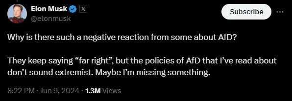 歐洲選舉的影響力之大,也引起了遠在彼岸的馬斯克的興趣。這位特斯拉掌門人在他的社群網路「X」上這樣寫道:「什麼有些人對 選擇黨AfD 的反應如此消極?他們總是說選擇黨是」右翼極端主義「,但就我讀到的選擇黨的政策聽起來並不極端。是不是我錯過了一些什麼東西?」