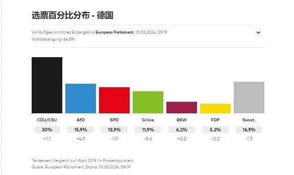 綠黨在本次選舉中取得了災難性的失敗。選擇黨則以15.9%的支持率成為德國選民中的第二大政治力量,比2019年上漲4.9個百分點。不過說到最強勢的歐洲政黨,中右翼的「歐洲人民黨」獲得了最高支持率,這意味著馮德萊恩有望連任。(但其中變數還有很多)