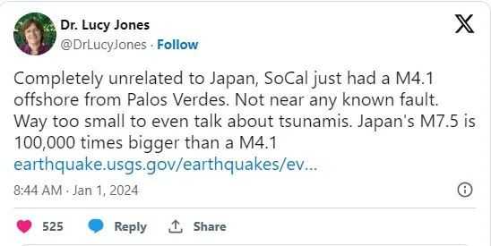 不過,著名的南加州地震學家露西·瓊斯博士(Dr. Lucy Jones)在Twitter上表示:「這次地震「太小了,甚至不足以談論海嘯,日本的M7.5比洛杉磯M4.1大10萬倍。」