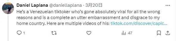 委內瑞拉裔的企業家丹尼爾·拉普拉納 (Daniel Laplana) 在 X 上寫道:「他因為各種錯誤的分享而走紅,這對我的祖國來說是徹底的尷尬和恥辱。」