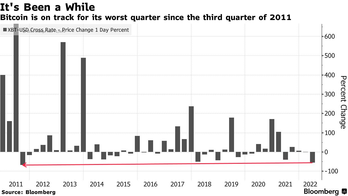 随着各大央行陆续表露出极为强硬的态度以压低通胀率,以及一系列与加密货币有关的负面新闻打击市场情绪,比特币可能迎来10多年表现最差的一个季度。智通财经了解到,彭博社汇编的统计数据显示,这一市值最大加密货币一度达58%的季度跌幅是自2011年第三季度以来最大季度跌幅,当时比特币还处于起步阶段。