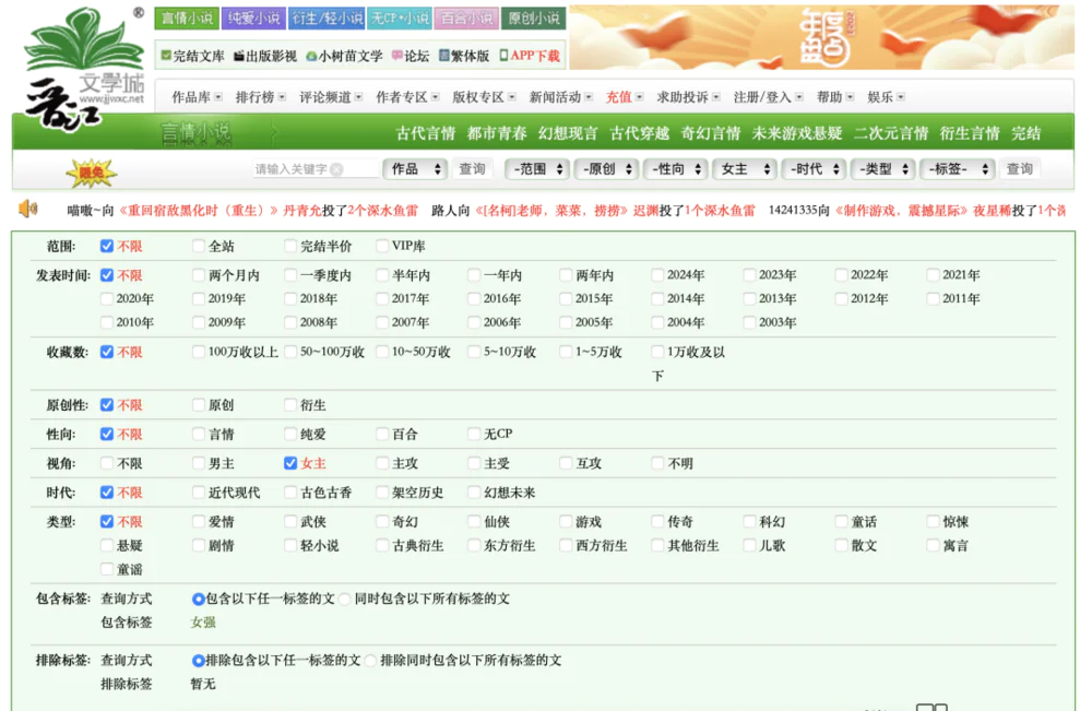 另一个原因则涉及网文读者之间愈加明显的分化。尽管“女频读者”往往被外界看作一个整体,但实际上这一范畴所指代的群体的审美趣味千差万别。晋江文学城在2023年11月开辟了“无CP+”分站,或许就是这种分化越发激烈的表征之一。由于之前晋江文学城的“无CP”分类包括纯爱小说和“大女主”/“大男主”无CP小说,同一分区下的不同类文本的受众常常在同一篇小说下相遇,不同的阅读期待和感受使得二者时常爆发矛盾,影响阅读体验。