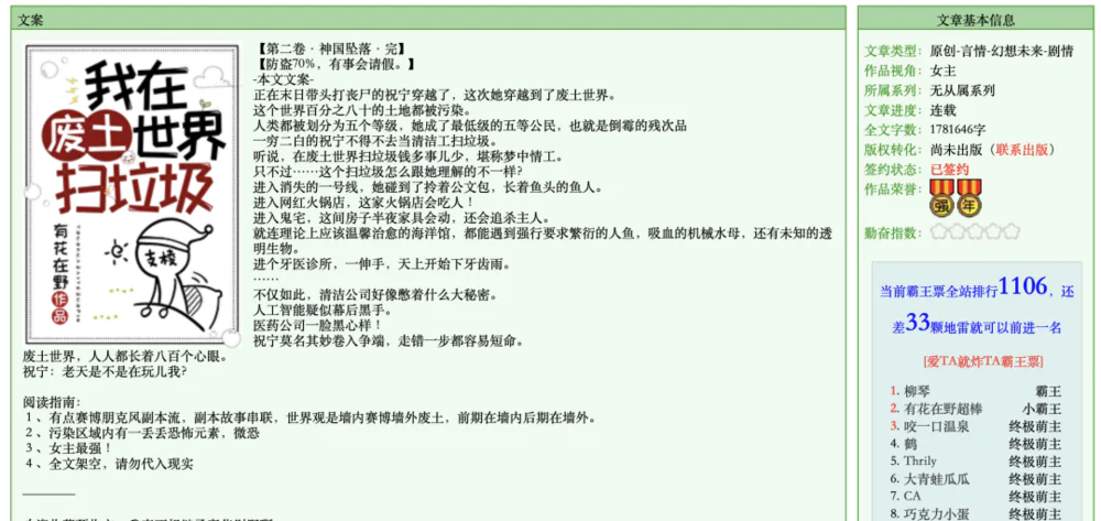 这种对读者评论的重视也说明,“大女主”小说的写作与阅读并非孤立的两个过程,读者的阅读活动常常被纳入文本评价体系中。这并非“大女主”小说的固有特点,而是网络文学区别于传统纸媒文学的关键特质。对于网络文学来说,读者参与不仅仅表现为作品点击量、收藏量、粉丝追更人数、月票数等量化数据,其本身也是小说创作和传播过程的重要组成部分。