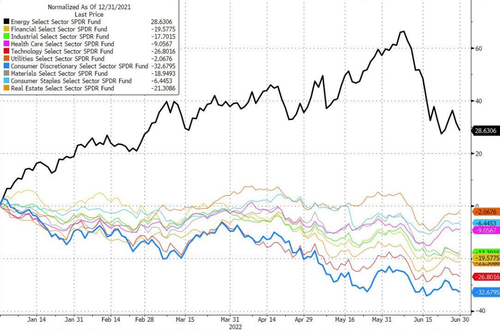 分行业来看,美股上半年仅有能源股一枝独秀,其他板块都在下跌。跌幅最大的是可选消费,反映出在高通胀和衰退恐慌下,投资者担心不确定性增加。