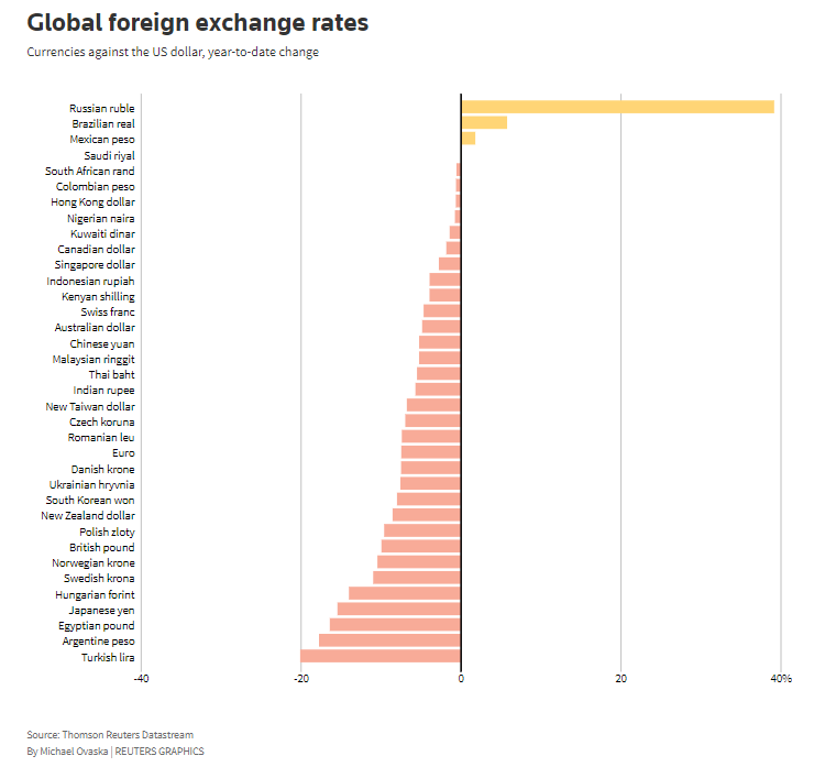 今年以来,非美货币中俄罗斯卢布、巴西雷亚尔和墨西哥比索兑美元涨幅居前;土耳其里拉、阿根廷比索、埃及镑、日元和匈牙利福林等货币跌幅居前。