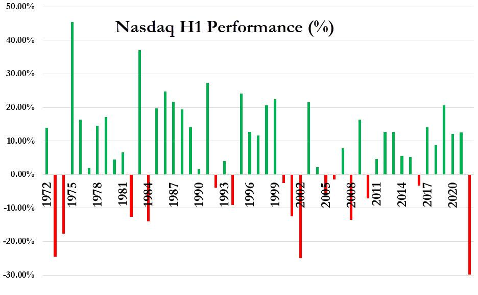 道琼斯工业平均指数上半年累跌15.31%;纳斯达克综合指数,上半年累跌29.51%,超过了2002年互联网泡沫破裂期间的跌幅,为该指数有史以来最大的上半年跌幅。