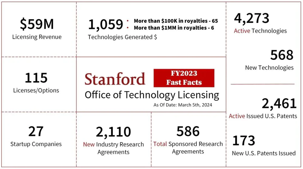 刚刚公布的2023财年数据显示,过去一年,斯坦福授予了115份技术许可/期权协议。目前斯坦福手上有2461项专利是活跃的(仍然在专利保护期内),在2023年为斯坦福创收5900万美元。