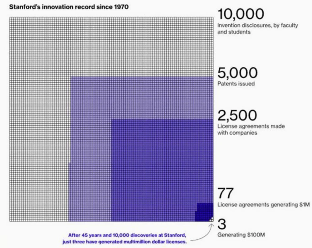 而斯坦福大学在过去的约35年里,从专利授权费中获得的也不过5.96亿美元。