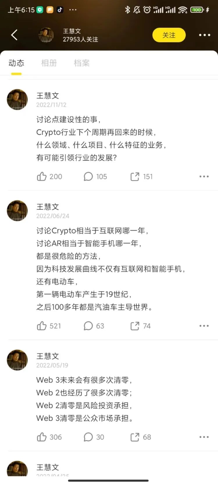 去年4月,王慧文将即刻签名改为“正在学习Crypto”。Crypto(加密货币)在之后七个月里都是王慧文的研究主题,此间他在即刻上频频发起关于Web 3和加密货币的讨论。而围绕加密货币的Web 3和NFT概念在去年一年里急起急落,直到11月中那条以“Crypto行业下个周期再回来的时候…”开头的动态发出,王慧文似乎告别了加密货币。
