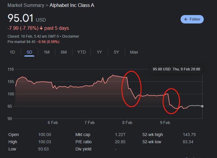 比网友们反应更快的,无疑是投资者和市场了,2月8日,谷歌母公司Alphabet股票断崖式下跌9%,