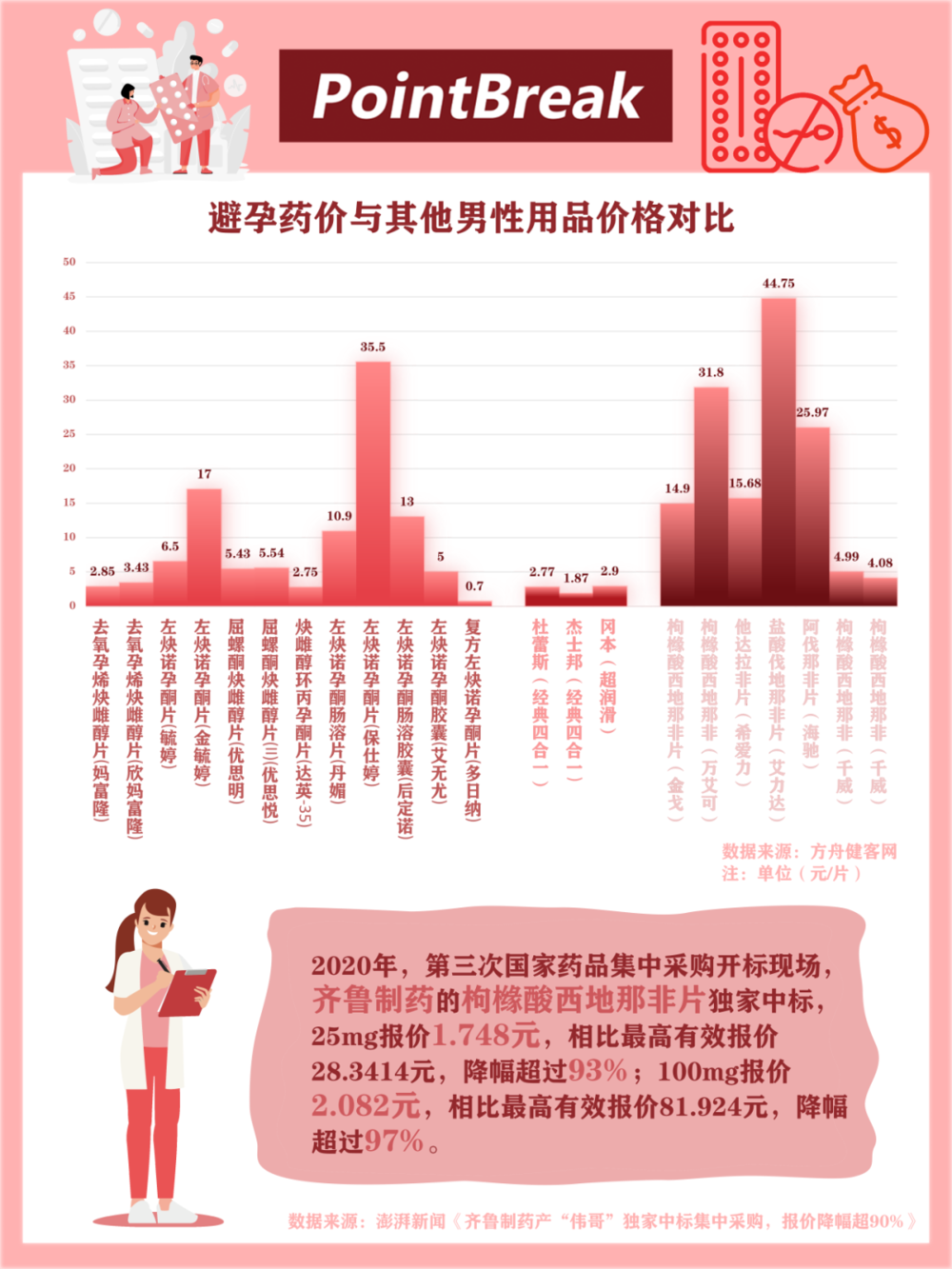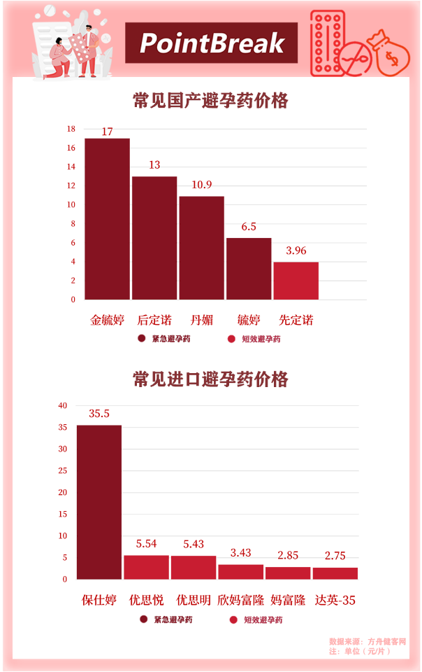 若不通过免费渠道领取,以毓婷为代表的紧急避孕药在价格上约为6元/片,以优思明为代表的短效避孕药价格则约为100元/盒。除此之外,还有更为昂贵的进口避孕药,价格可达国内同类药物的二至三倍。