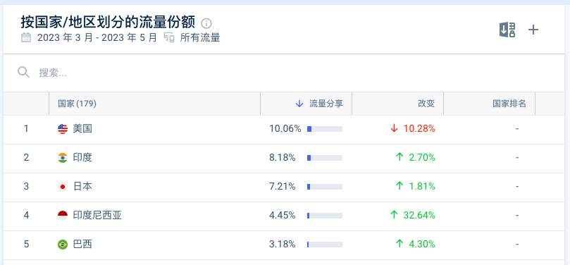 除了摩根士丹利的报告,还有一些数据可以作为佐证。根据SimilarWeb数据,3月-5月,美国、日本是全球为ChatGPT贡献流量份额最高的国家,分别位列第一、第三。不过,最近,美国的流量已经下滑了10.28%。