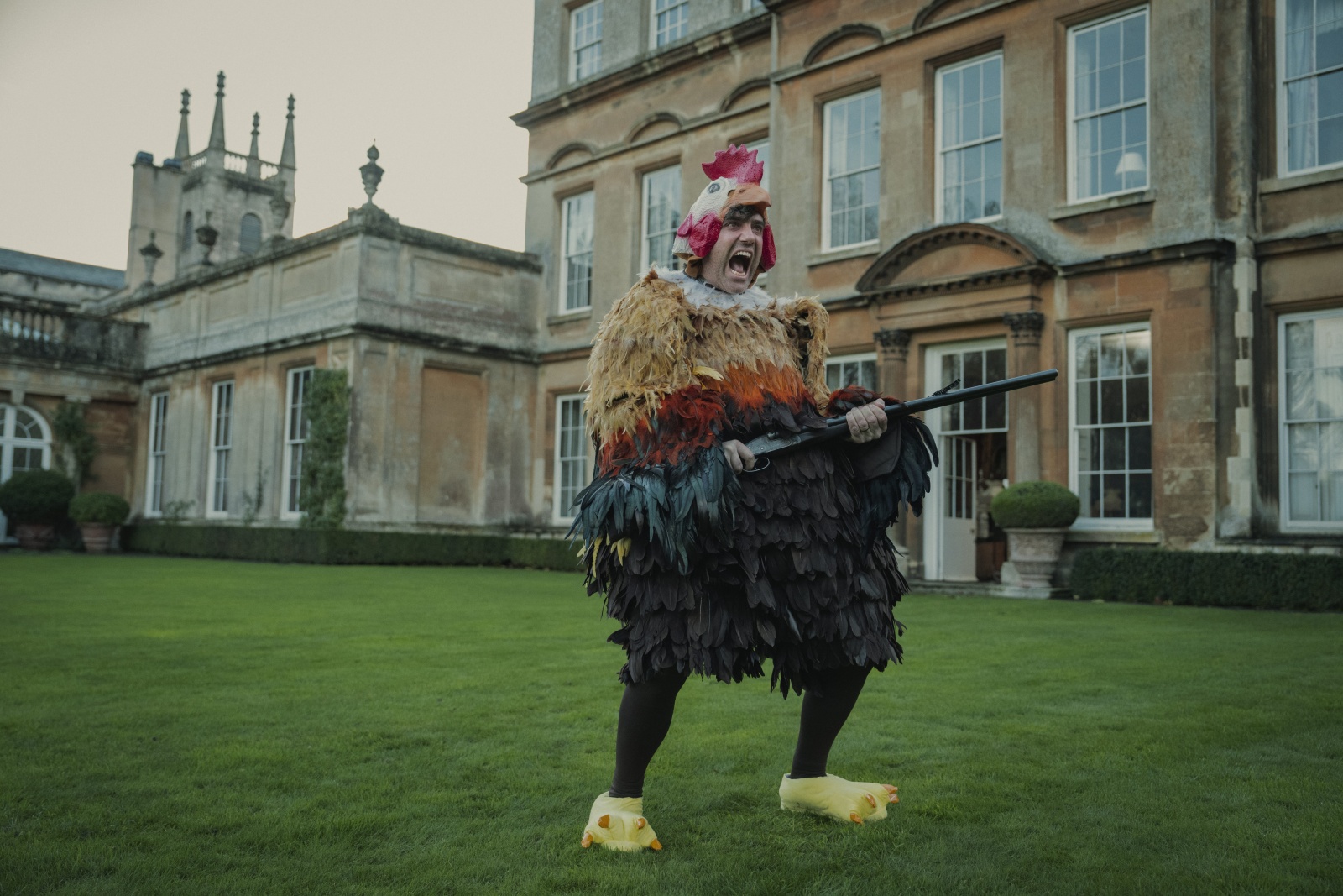 小人物有了,草台班子也组建好了,那么,接下来的重中之重,便是“唱戏”。《绅士们》的故事里,唱戏是所有人的终极渴望,每个人都知道舞台有限,一定要珍惜上台的时间。盖·里奇反复渲染和利用着这过度的表演欲——黑帮大笔一挥免去四百万英镑债务的条件,是债务人穿上戏服扮演一只真正的小鸡;没落贵族为了拥有表演天分,不惜为储存希特勒的生殖器官建造一座地堡;网红打劫了黑帮的大麻基地,第一时间想到的是剪辑配乐上传网络;就连调查记者在深入虎穴勒索黑帮之前,都要精心写个剧本,还非要逼人看完。
