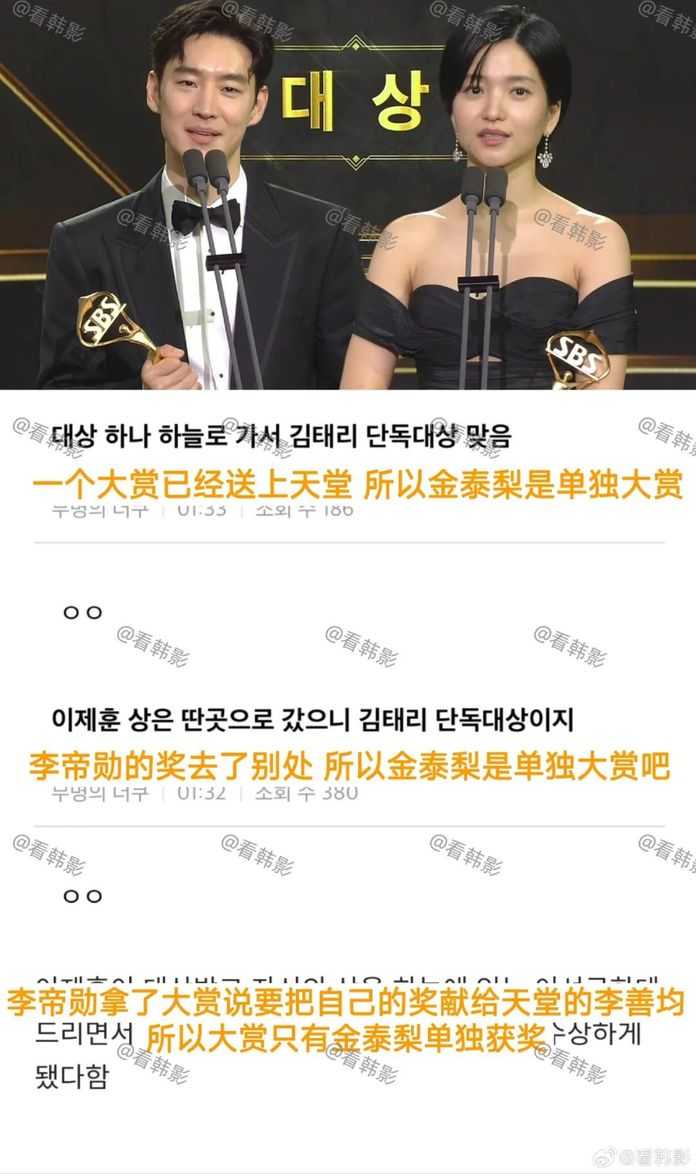 他不出入娛樂場所不出軌其他人就沒有後面這些遭遇。為什麼要給他洗白?既然李帝勳要把獎給李善均,那金泰梨單獨拿大賞好了。(大賞是雙黃蛋)