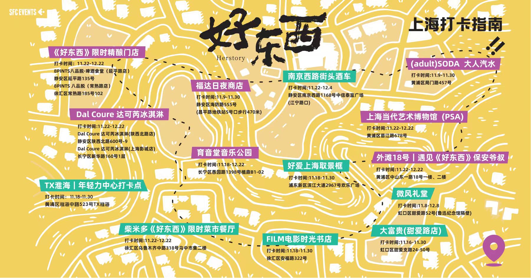 首周末,SFC EVENTS携手电影合作方麦特影业、阿里影业、久事文传共同推出《好东西》上海打卡指南,在地图中的各个商户都会为《好东西》观众提供特别优惠。地图上,用粉红色标记的“育音堂音乐公园”“福达日夜商店”“外滩18号|遇见《好东西》保安爷叔”等是电影里出现过的场景,绿色标记的“微风礼堂”“TX淮海”“电影时光书店”等则是有影片特色装饰以及电影元素的打卡地,丰富观众游玩路线。