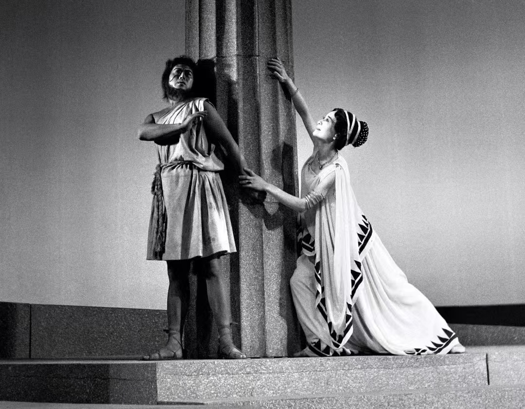 1979年《伊索》剧照,顾威饰演伊索、严敏求饰演克莉娅。