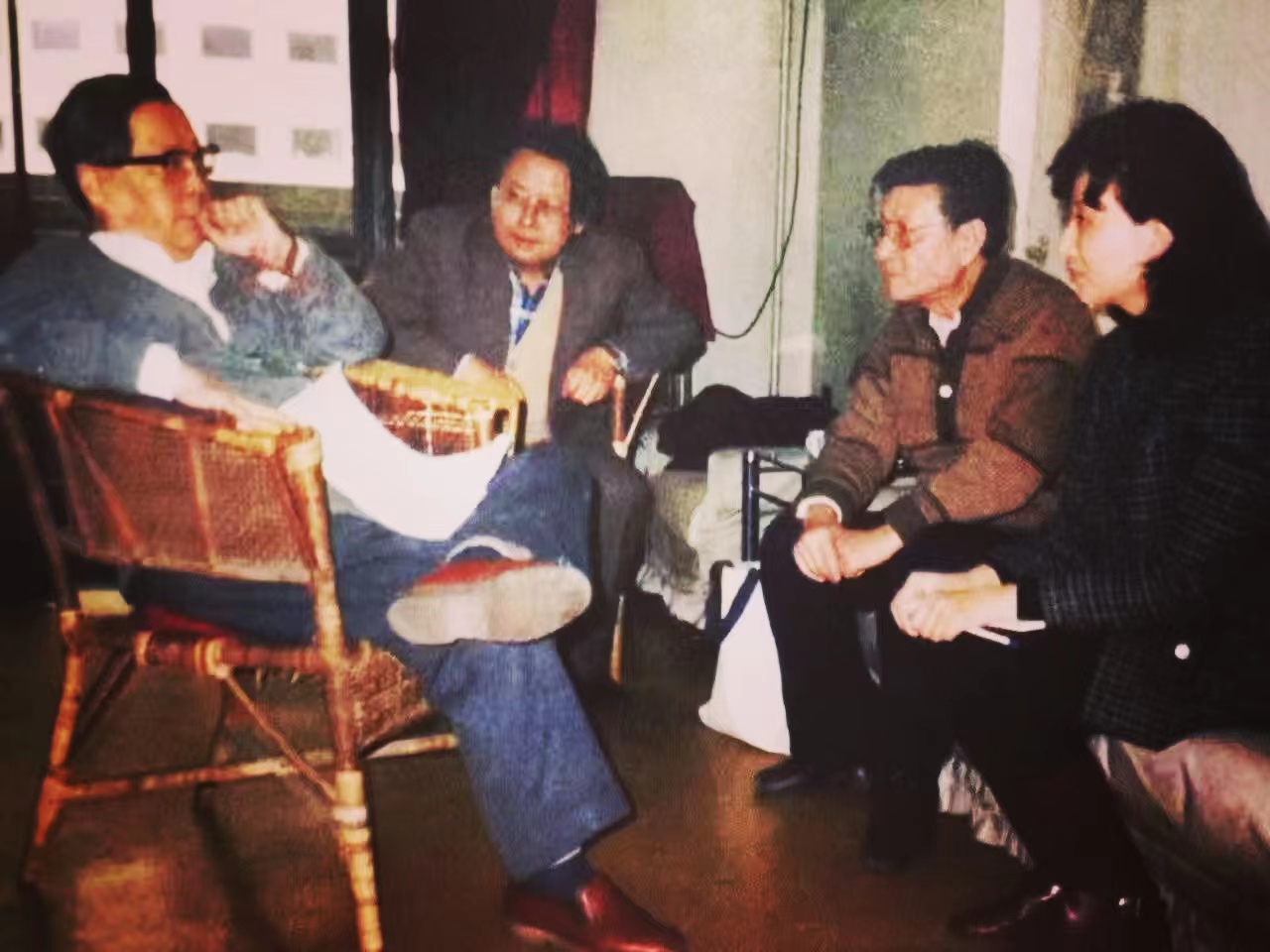 1987年年尾,顾威(左二)、夏淳(右二)、何冀平(右一)一同拜访老院长曹禺(左一) 受访者供图。