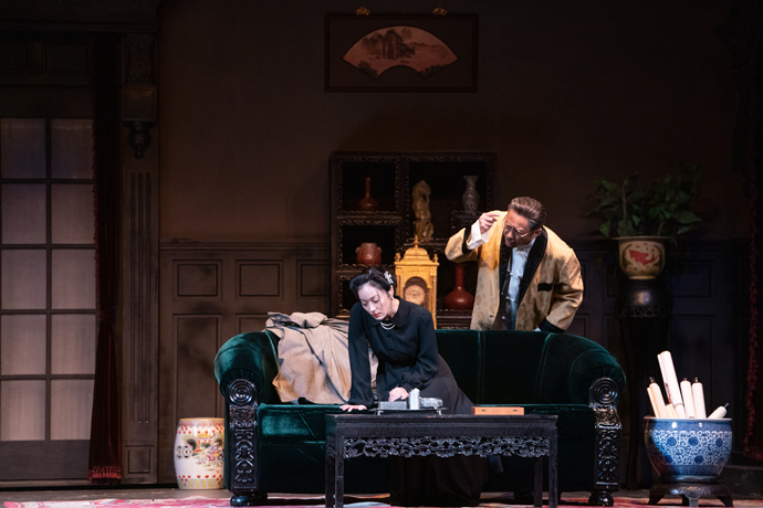 2022年《雷雨》演出剧照 王斑饰演周朴园(右立)、张培饰演蘩漪(左坐)