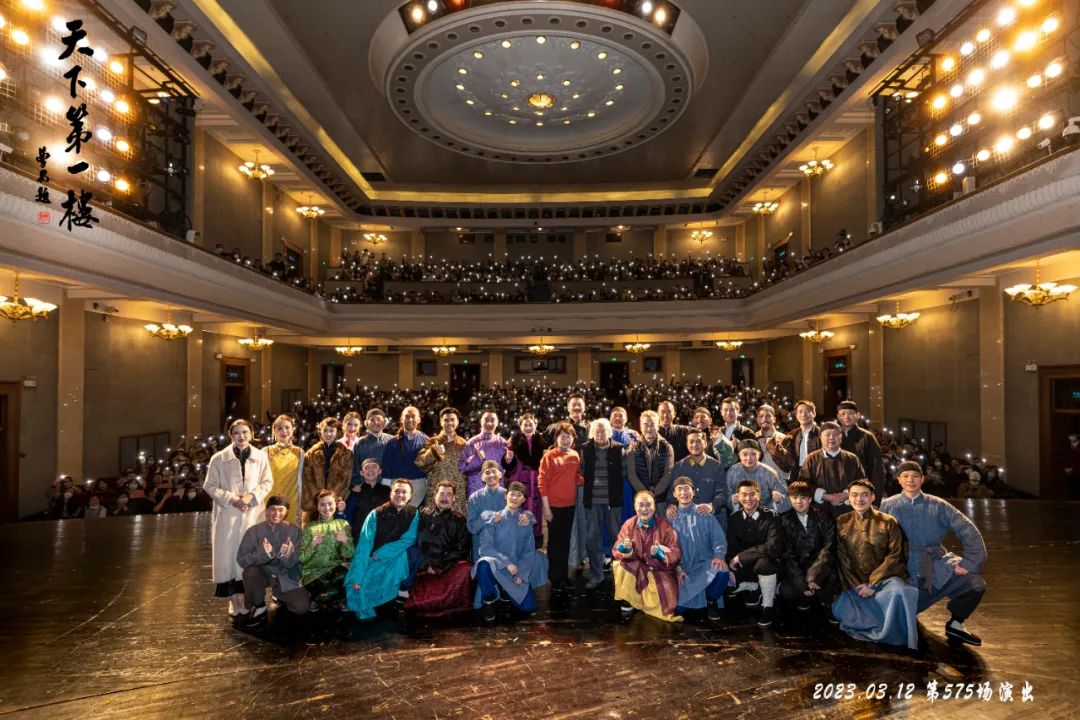 2023年《天下第一楼》第575场演出结束后,全体主创同首都剧场观众大合影。