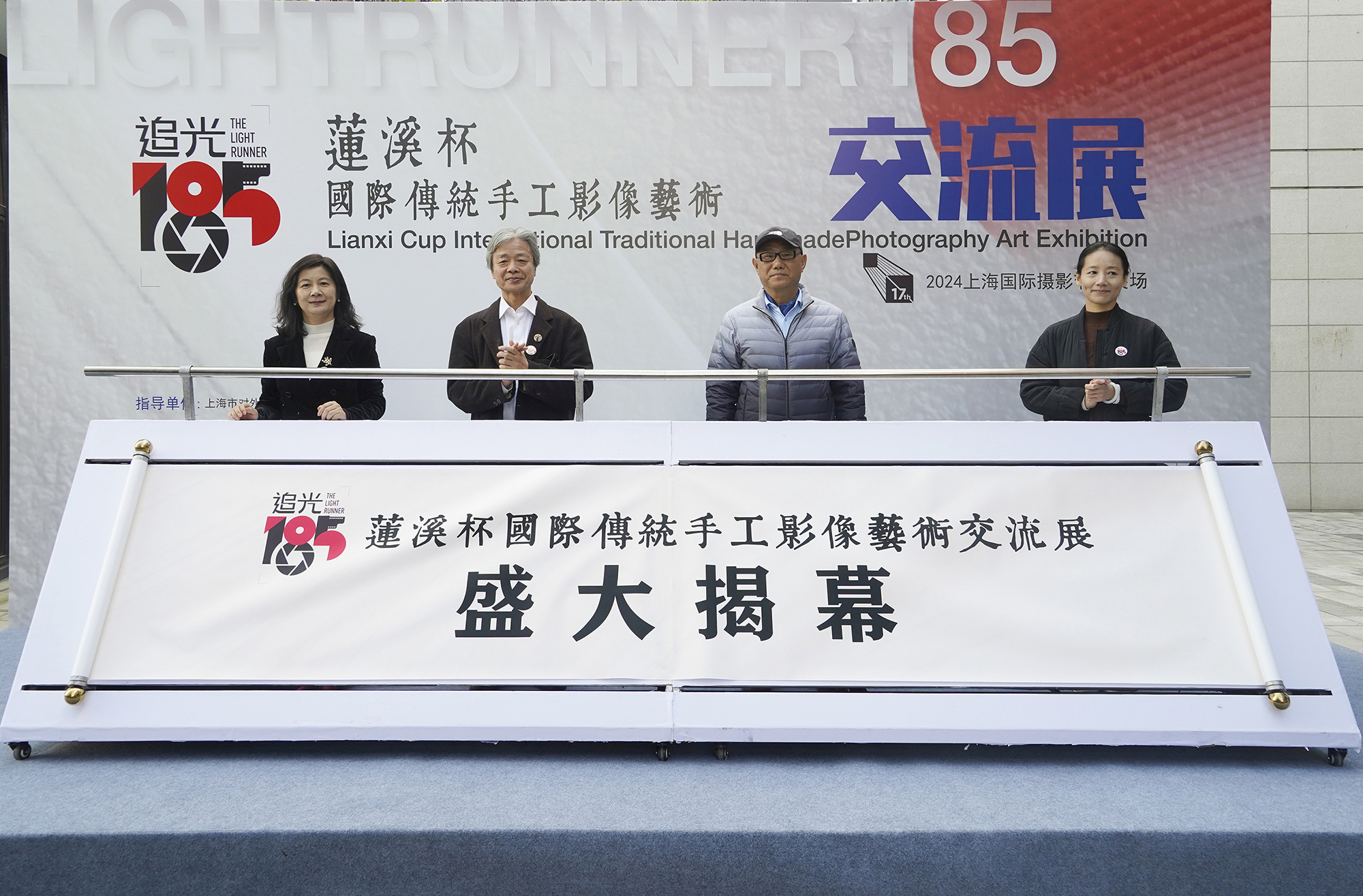 2024年11月23日,展览评委饭泽耕太郎(左二)、上海对外文化交流协会文艺处张曼(左四)、上海市摄影家协会副主席毛安吉(左三)、北蔡镇人大主席郎凤芳四位嘉宾为展览启动揭幕画卷。本文图片由上海老照相机摄影博物馆提供