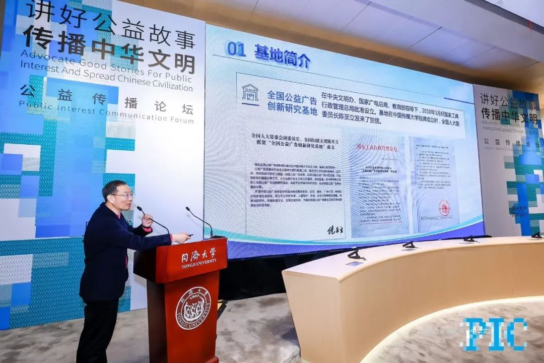 同济大学党委副书记吴广明致辞中表示,在上级部门支持下,学校坚持不懈用新时代中国特色社会主义思想铸魂育人,切实将价值引领深度融入人才培养和校园精神文明建设当中,充分运用广大青年学子喜闻乐见的生动形式,深耕公益传播这一领域,打造形成了赓续同济红色传统、彰显同济卓越特质的育人品牌。本次公益传播论坛的举办,既是学校多年来努力成果的集中呈现,也是学校深入推进“数智化、绿色化、融合化”改革在人文社科领域中的重要体现,希望各位专家多多贡献金点子、新思路和好创意,携手一起为公益广告行业和教育事业高质量发展持续献“智慧”,展“作为”。